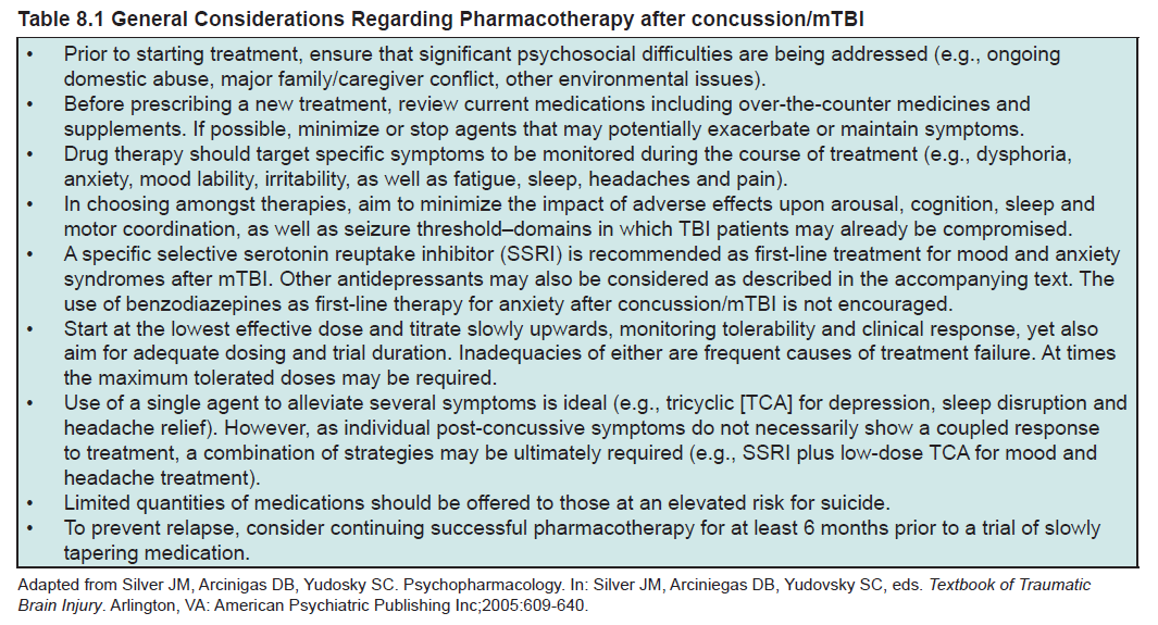 There is no current evidence to indicate that the mental health problems of individuals who have suffered a concussion should be treated any differently than mental health problems of other etiologies. As such, pharmacological and nonpharmacological interventions including therapeutic interventions that have been found to be helpful in the general population should be considered for individuals who have developed mental health problems post concussion. Strategies used to treat mental health symptoms post concussion/concussion should follow the same logic as that applied to similar symptoms found secondary to their conditions or circumstances which include the potential for treatments to worsen other concussion outcomes. For example, some antidepressant medications, particularly those that are more sedating and/or have greater anticholinergic activity, can worsen the anergia and cognitive impairments that arise directly from concussion. In general, psychotropic medications should be used with caution, and non-medication options selected as much as possible. If selecting a medication intervention, start at low doses, allow adequate time for response to be assessed for, and carefully monitor for both efficacy and side effects.