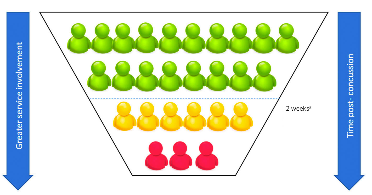 1. A large proportion of persons who sustain a concussion will experience resolution of symptoms within the first several weeks. This proportion would follow the green parts of the pathway diagram below. A smaller proportion (approximately 15 -20%) of individuals will go on to require interdisciplinary concussion clinic care and they would follow the yellow through to red parts of the pathway diagram below.
